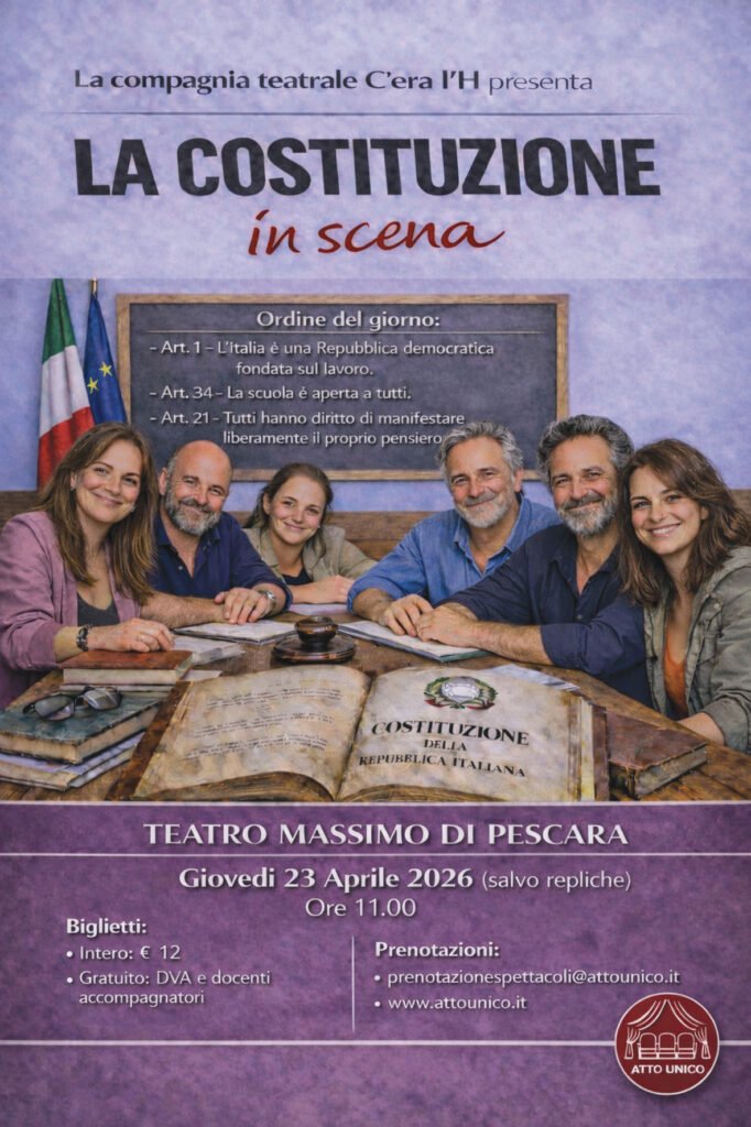 Descrizione: La Costituzione in scena è uno spettacolo di teatro civile ambientato in un’aula scolastica durante l’acceso dibattito di un consiglio di classe, in cui i tre punti all’ordine del giorno diventano occasione per concretizzare, attraverso problematiche tipiche della scuola, tre principi della nostra Costituzione. Nel primo quadro dello spettacolo, il principio del lavoro, che caratterizza l’articolo 1, si realizza nella delicata situazione di uno studente impegnato ogni sera per il sostentamento della famiglia, entrando, così, in conflitto con i tempi e le regole della valutazione scolastica. Nel secondo quadro, ispirato all’articolo 34, il tema del diritto all’istruzione è rappresentato da un viaggio di studi della classe che fa emergere le disuguaglianze economiche e sociali tra studenti.